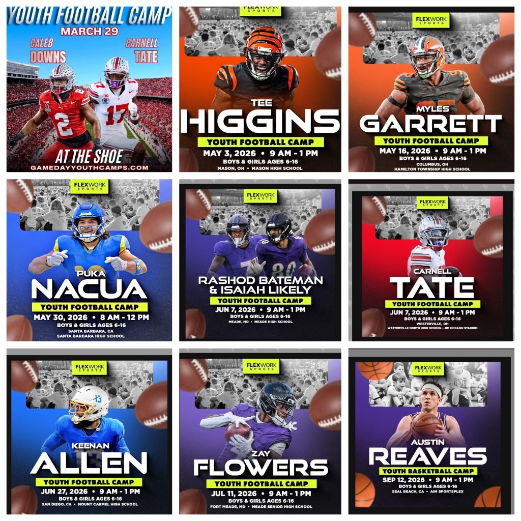 FlexWork Sports Management partnership provided up to 5 ICSA Scholarships for NFL and NBA Camps:Â 2021 QB Justin Fields, 2022 QB C.J. Stroud, 2024 WR Garrett Wilson & WR Jaxson Smith-Njigba; May 2025 & May 2026 All-Pro DE Myles Garrett NFL, July 2025 OSU WR Jeremiah Smith, and exciting upcoming May 2026 Cincinnati Bengals WR Tee Higgins and L.A. Rams WR Puka Nacua, June 2026 Baltimore Ravens WR Rashod Bateman/ TE Isaiah Likely, Los Angeles Chargers WR Keenan Allen and OSU Buckeye NFL LOTTERY PICK WR Carnell Tate, July 2026 Baltimore Ravens WR Zay Flowers Football Youth Camps and kicking off the Basketball Camps with September 2026 Los Angeles Lakers SG Austin Reeves in California to showcase the skills & drills participation for our nationwide student athletes.